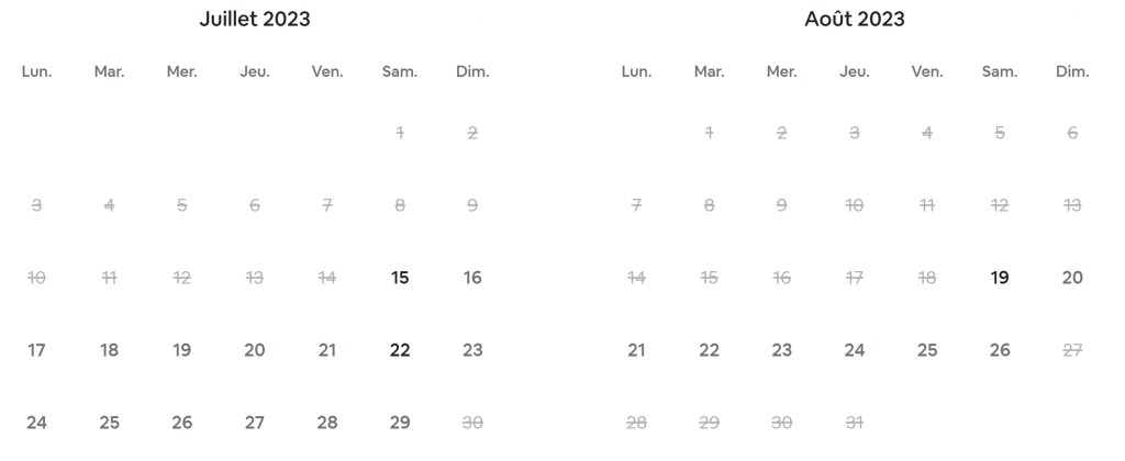 Availabilities for Summer 2023 : 15 July – 29 July and 19 August – 26 August